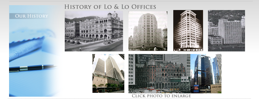 Queen's Building Central Hong Kong in late 1950s.  Lo & Lo's first office from 1915 to 1950. Alexandra House in the 1950s.  Lo & Lo moved to its second office in 1950 and was located there from 1950 to 1958. Jardine's House in the 1960s, later changed to Wheelock House.  Lo & Lo moved to its third office in 1958 and was located on the 7th and 8th floors from 1958 to 1975. Swire House in the 1970s, now Chater House.  Lo & Lo moved to its fourth office in 1975 and was located on the 11th floor from 1975 to 1998. Gloucester Tower.  Lo & Lo moved to its fifth office in 1998 and was located on the 35th floor from 1998 to 2010. Lo & Lo moved to its sixth and current office in 2010 and it has been located on the 7th floor from 2010 to present.  View of General Post Office in 1964, now World Wide House and World Wide House today .